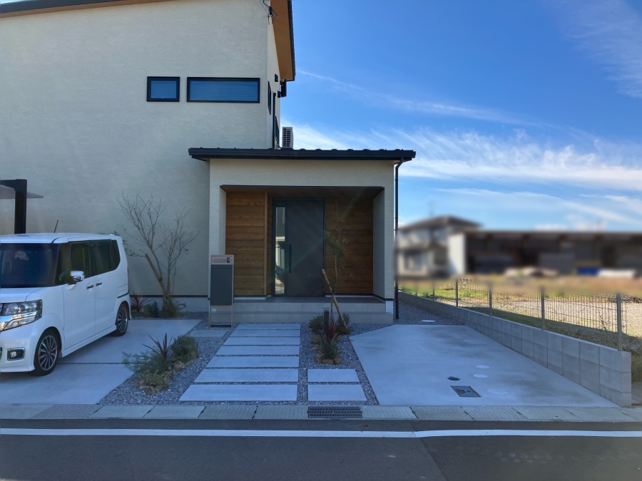 シンプルで存在感のあるユニソン ヴィコDB 100を採用し、建物の雰囲気に合わせたスタイリッシュな外構に仕上がっています。
