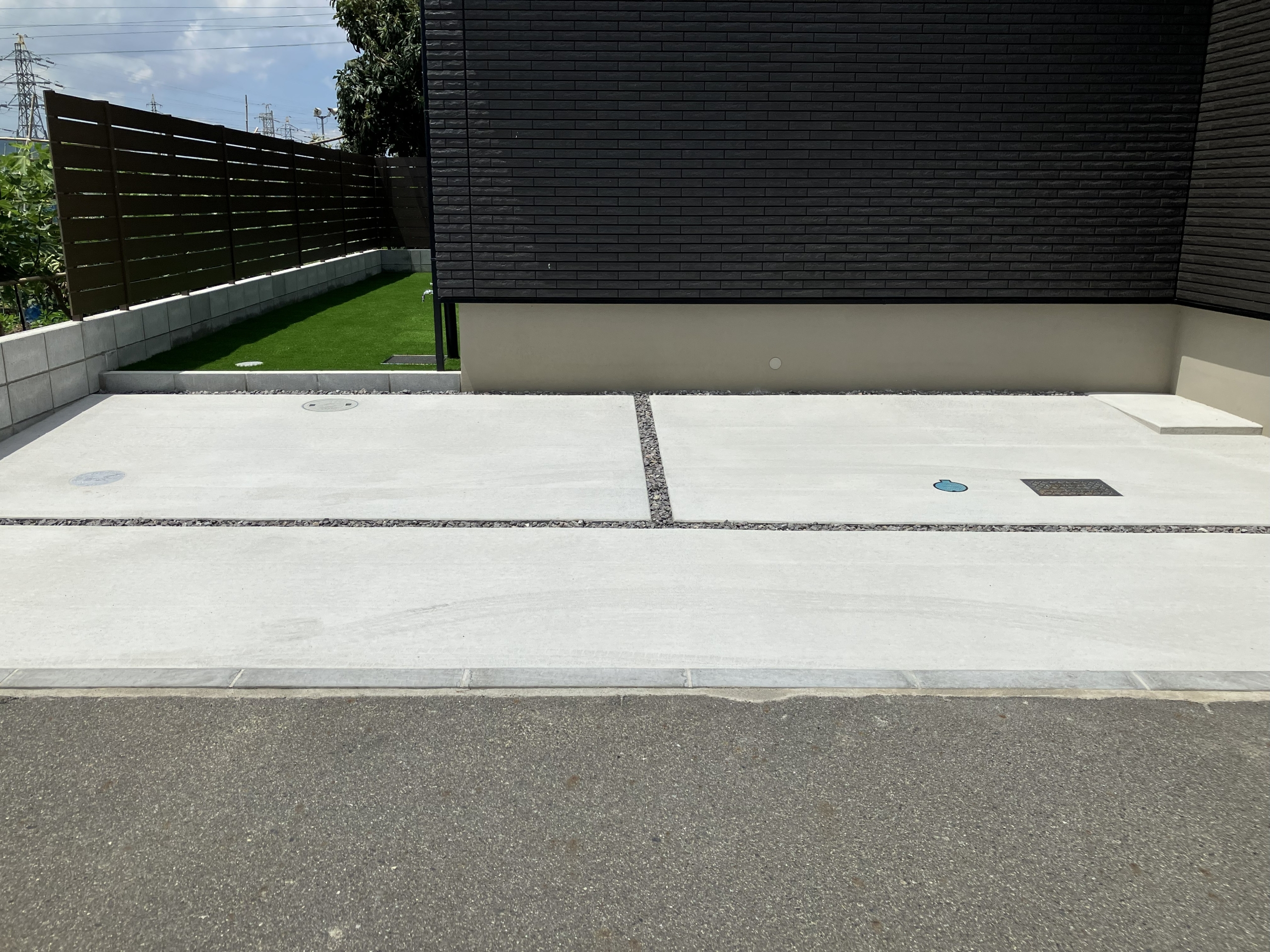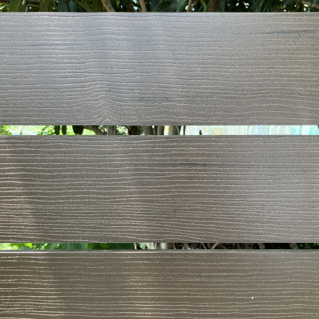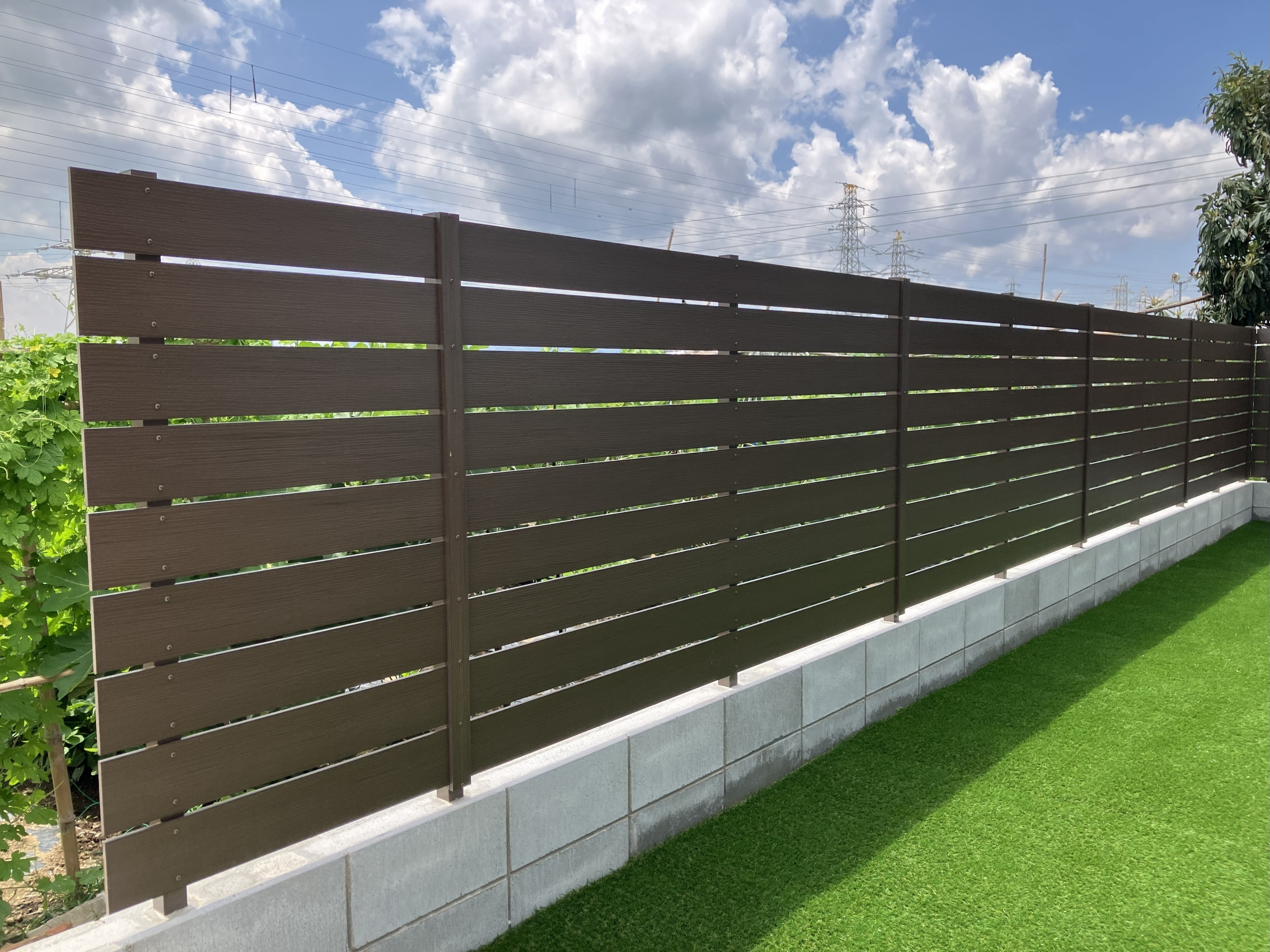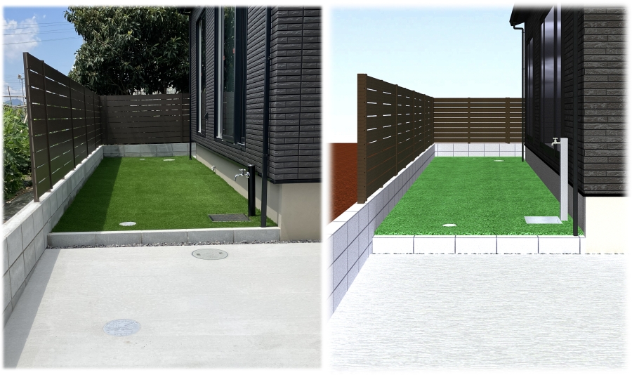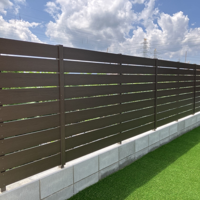 駐車スペースとは正反対の雰囲気なお庭スペース。人工芝の緑と目隠しフェンスのアーバンフェンスが鮮やかさと木調の温かさを与えてくれます!今回採用しているアーバンフェンスはシボ加工というものがされていてリアルな木調を表現しているのでより木調の温かさを感じることができるのではないでしょうか。アーバンフェンスについて詳しくはこちらから!
