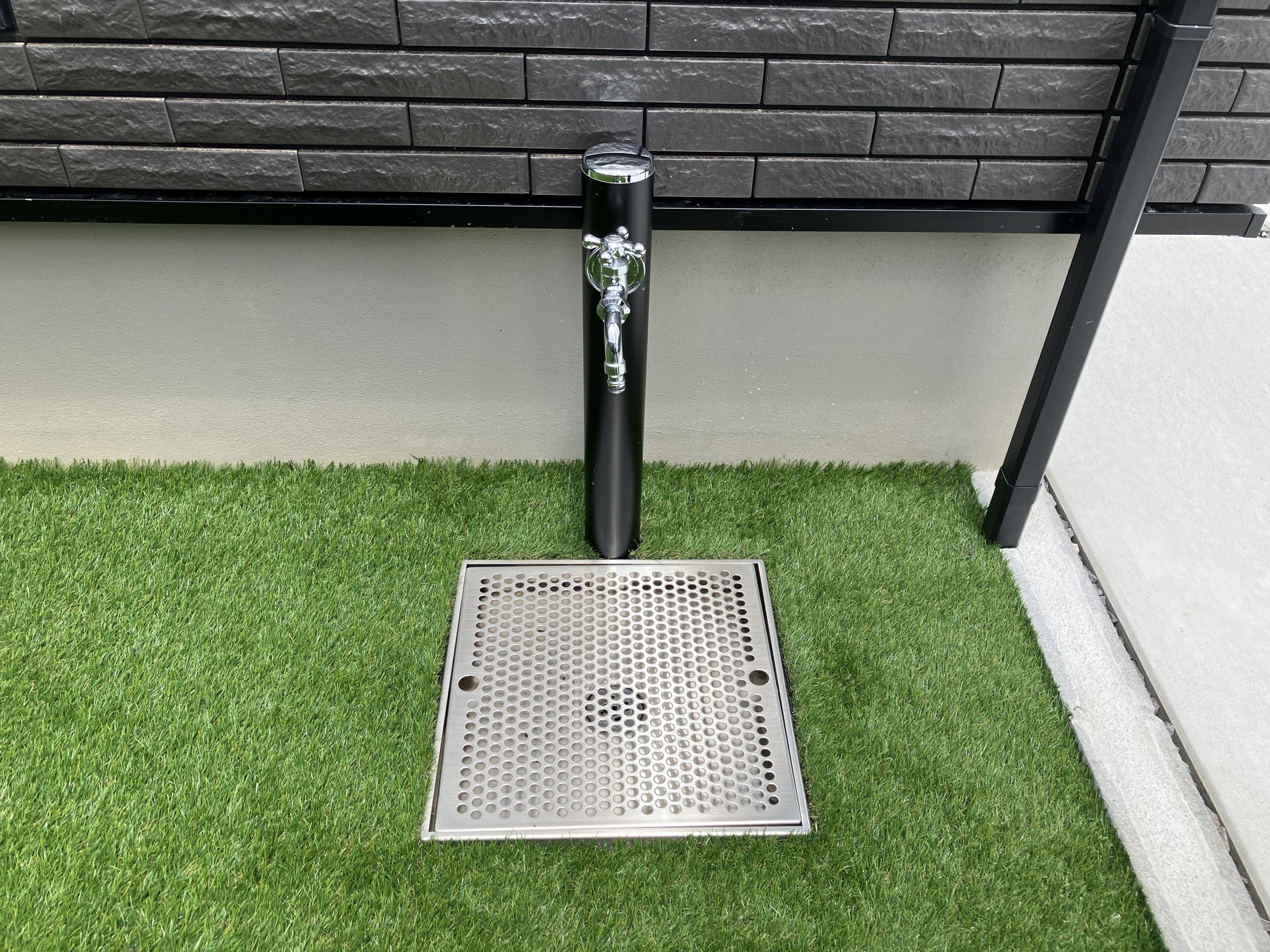 駐車スペースの端に立水栓・パンを設置することで洗車や趣味道具のお手入れ、ガレージ内の掃除などがしやすくなります。背の低い立水栓にすることで主張が押えられるので立水栓の存在感はあまりなく外構全体に馴染むようになっています。パンは土間とフラットになるものにすることで通行の妨げにならずに立水栓と同様に外構全体に違和感なく馴染んでくれます。