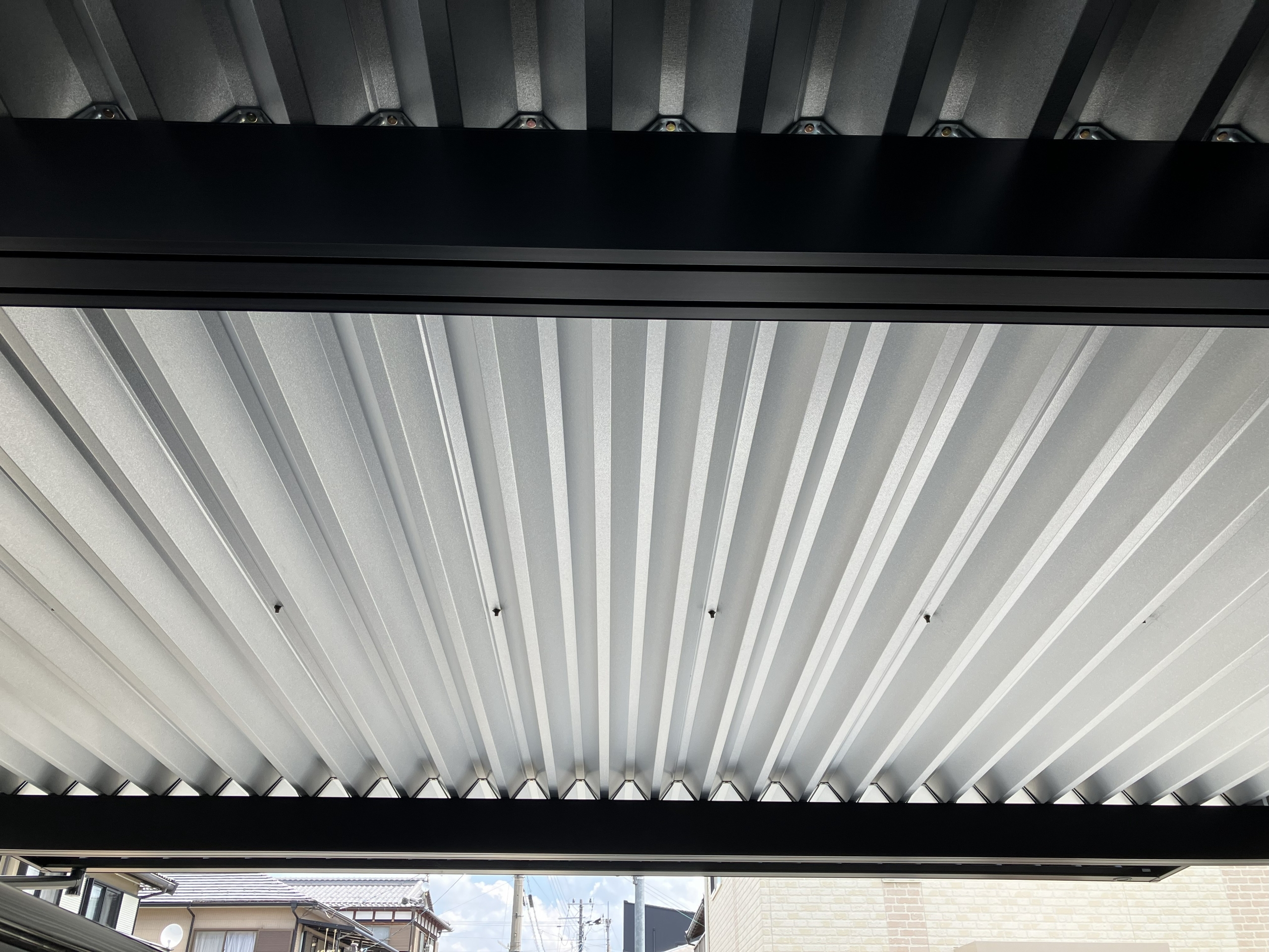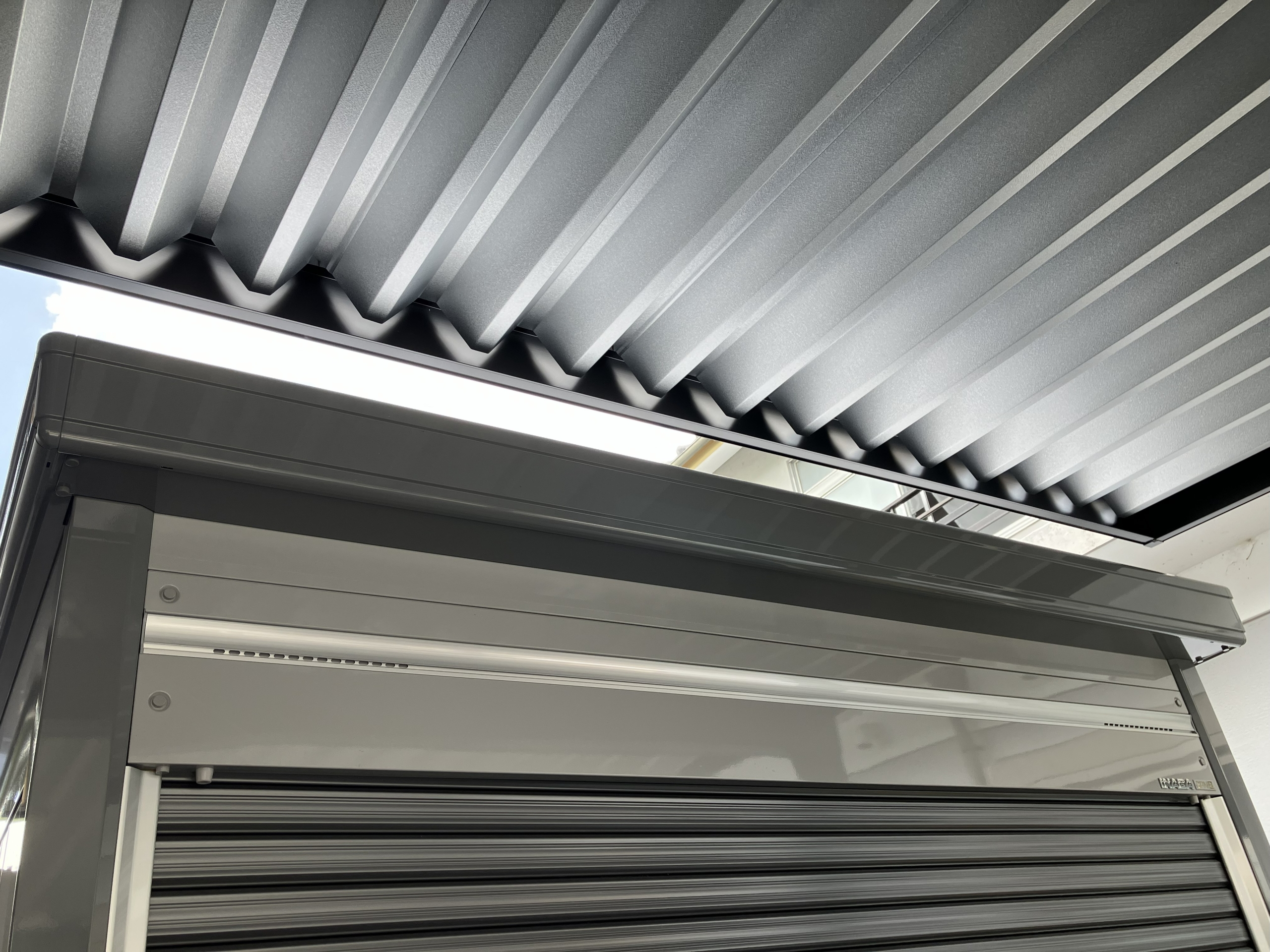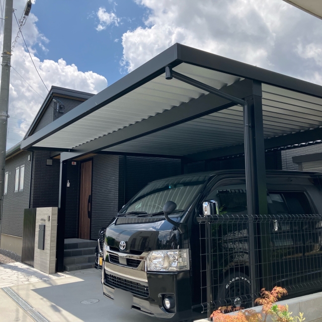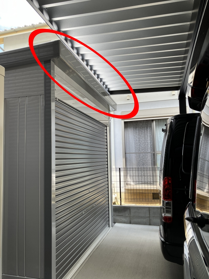 ガレージのシャッター部分とカーポートを重ねるような高さでカーポートを設置(カーポート写真②)