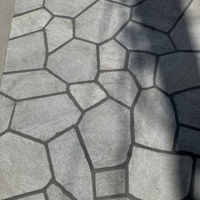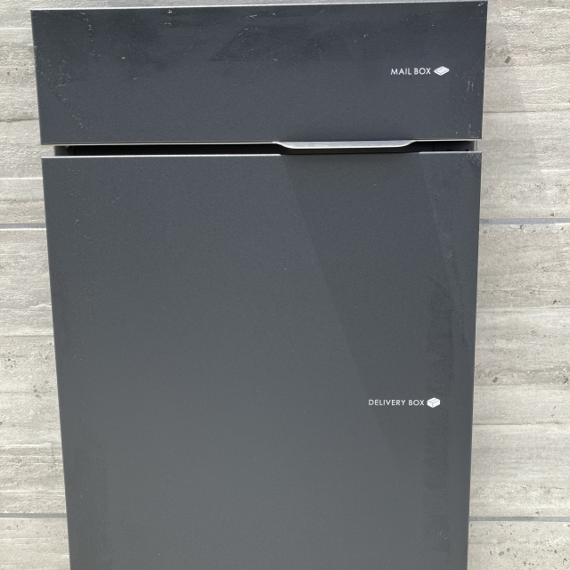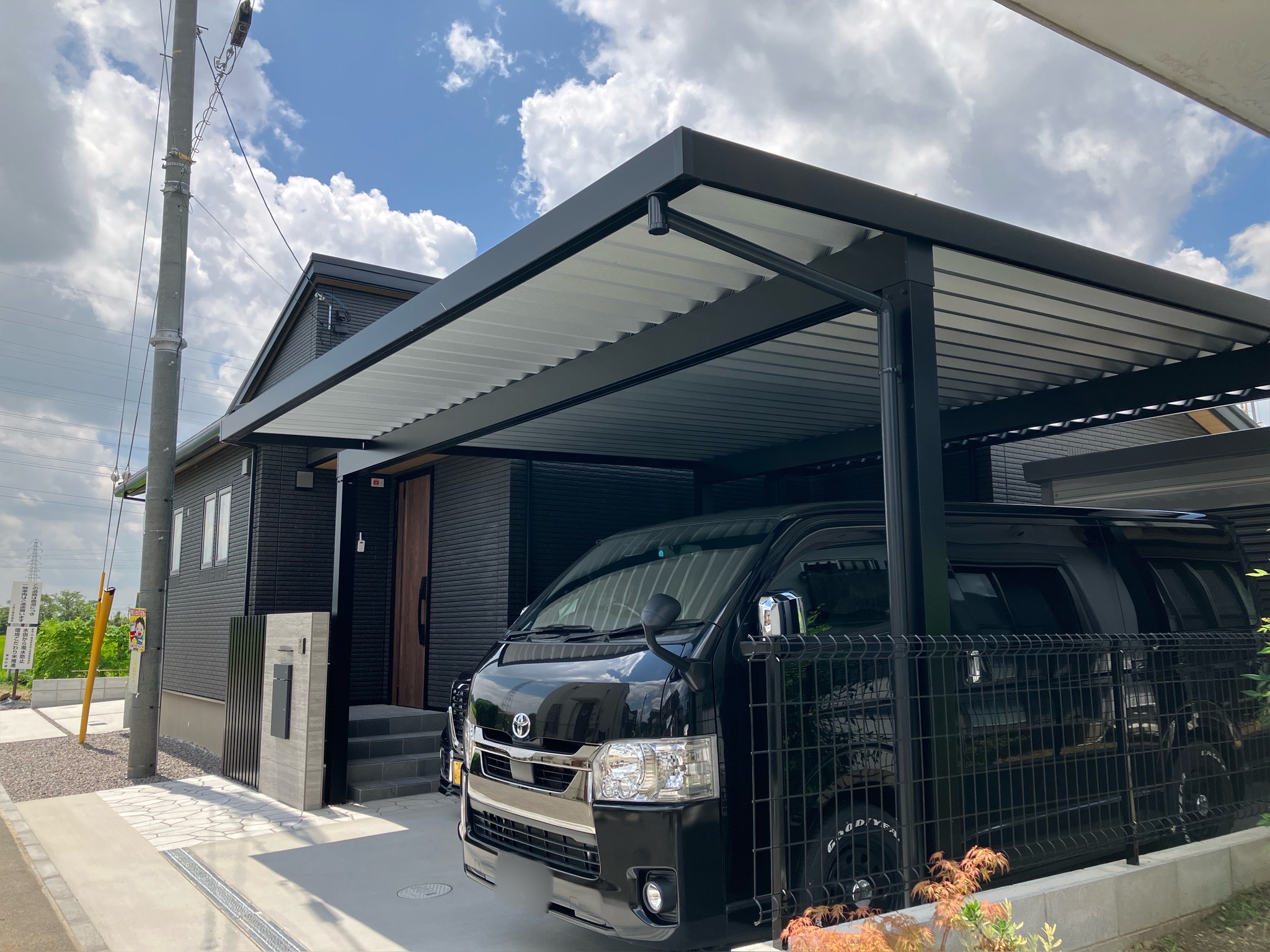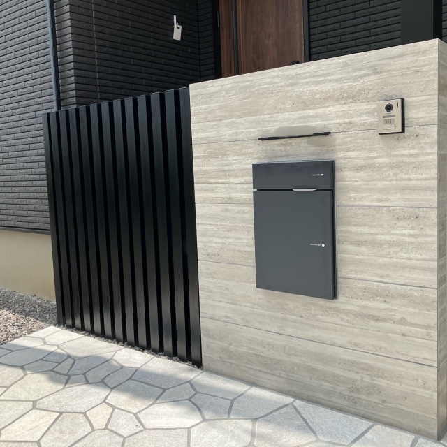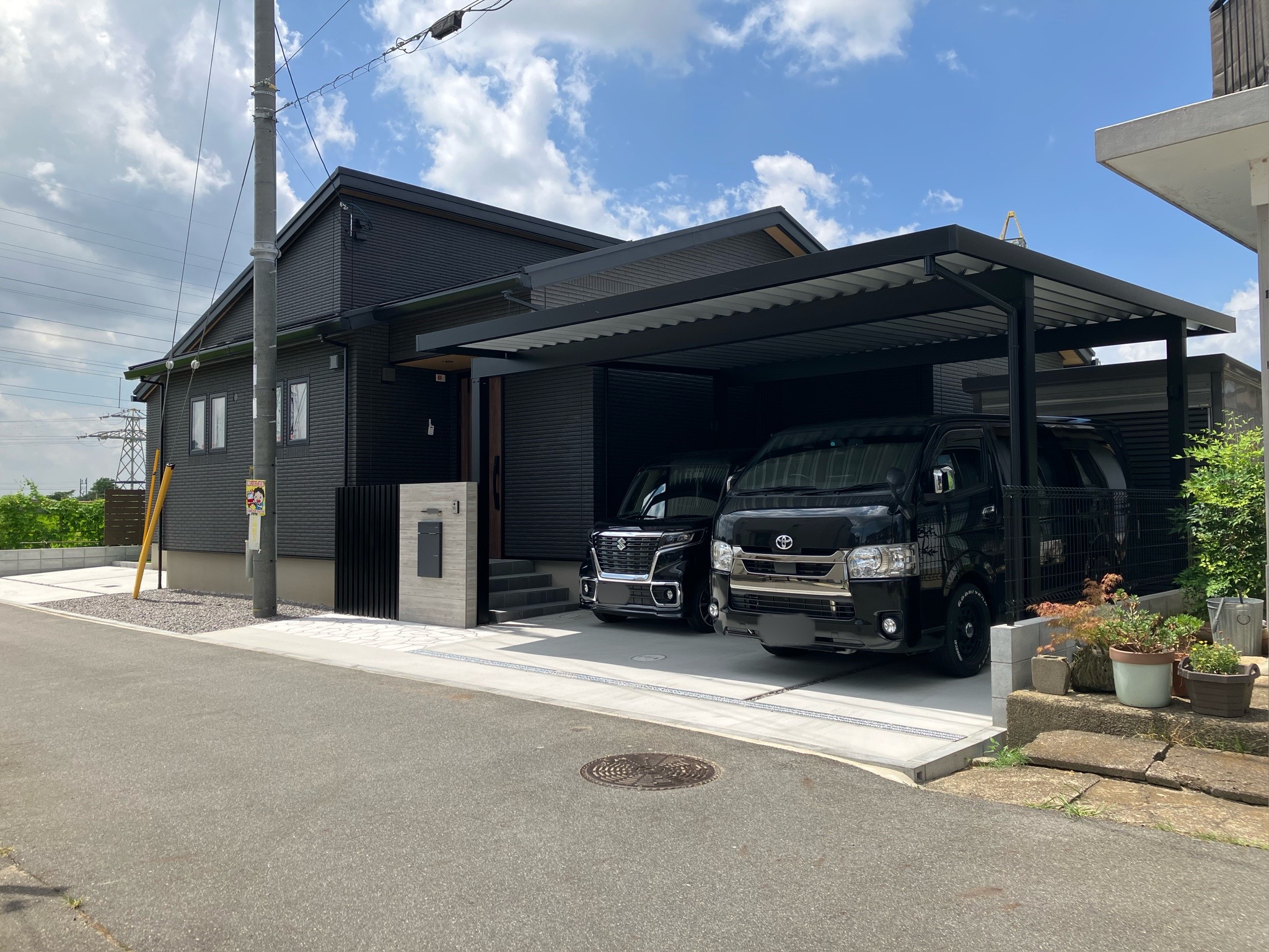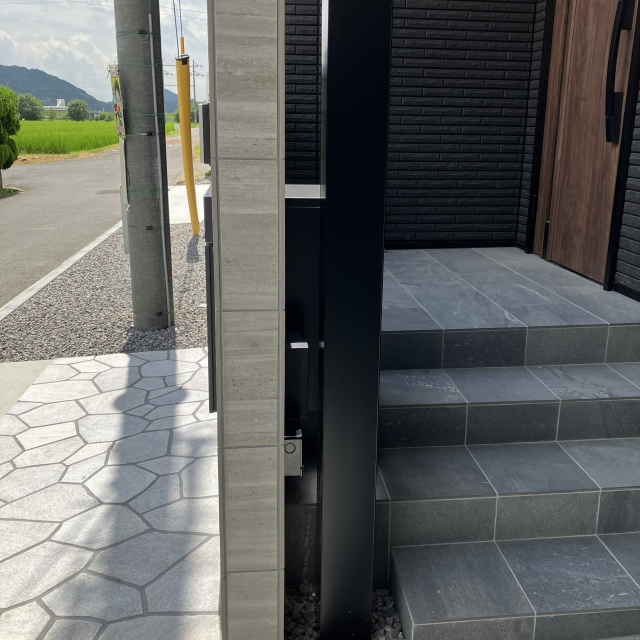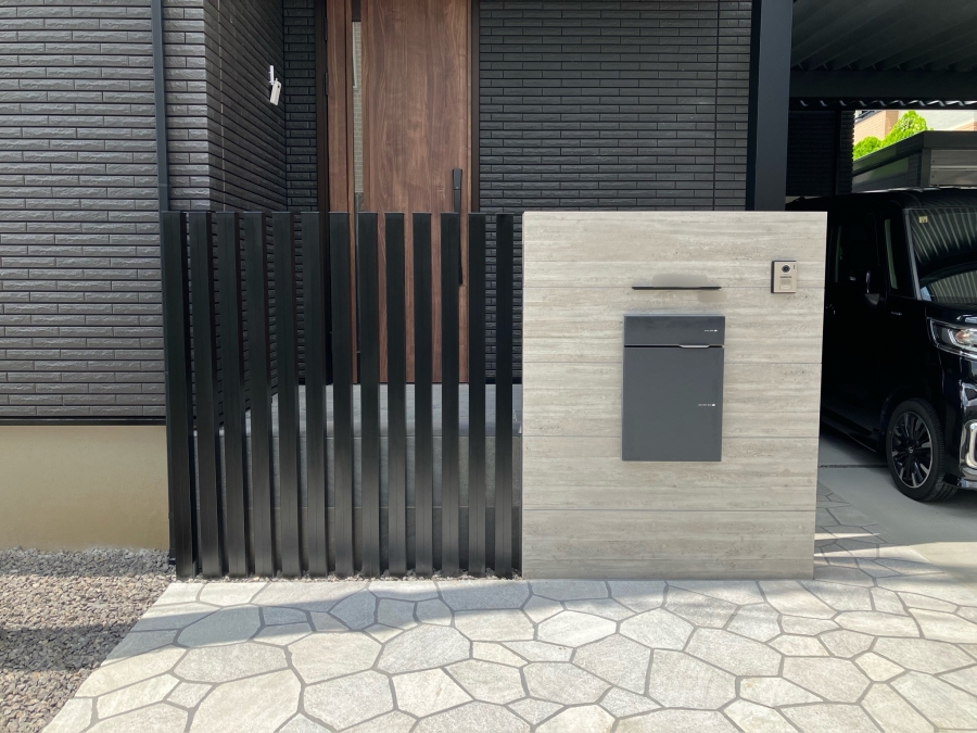 門柱や乱形石をグレー系にすることで、駐車スペースのかっこよさを残しつつも重たい雰囲気にはならず黒でまとまった中に抜け感を演出しています!