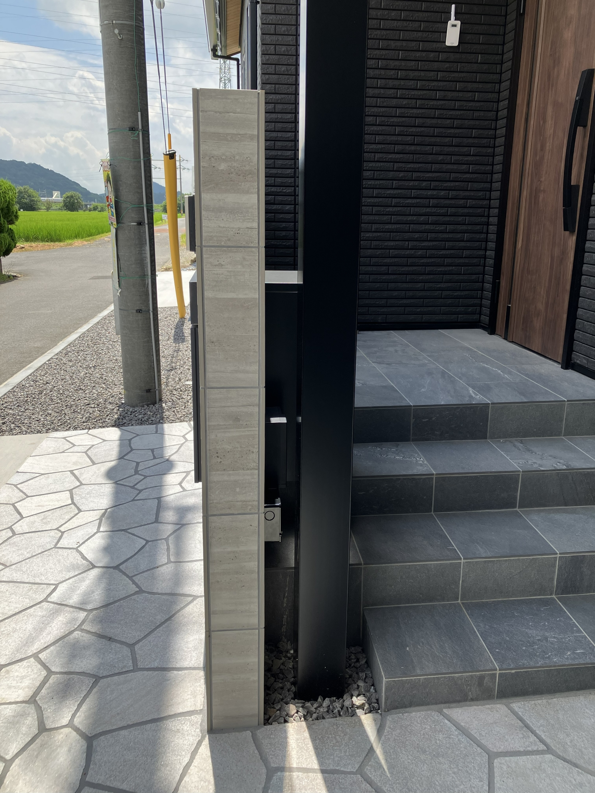 乱形石は太陽に当たるとキラキラと光るようになっているので、高級感も感じられ門柱には格子を組み合わせることで閉鎖的にならず且つ格子の間隔を少し狭くすることで玄関の目隠しの役割もしっかり果たしてくれています!