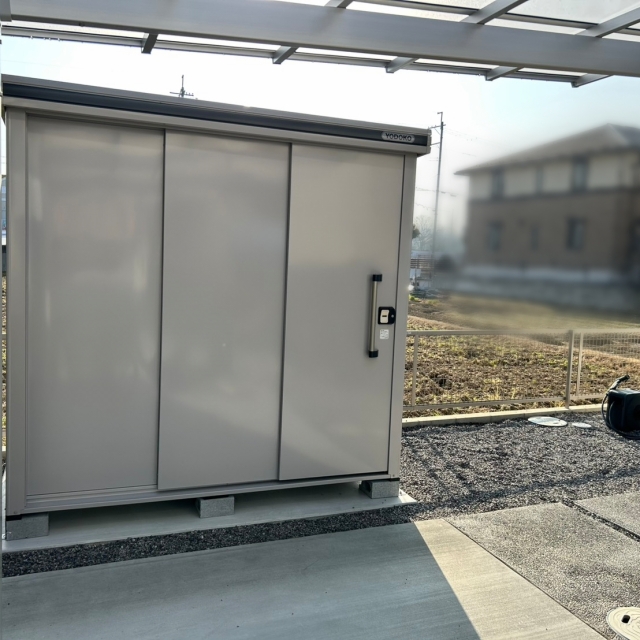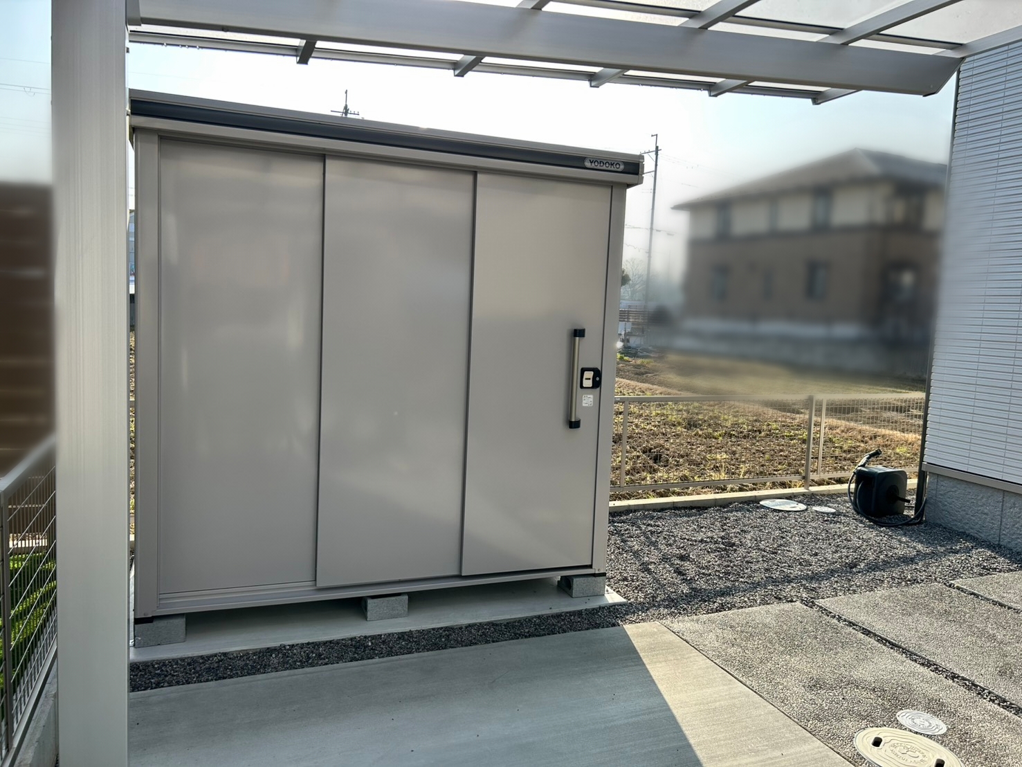 駐車スペースの後ろに設置されている物置は、横開きになっていて車を停めた際でも取出しやすいようになっています。