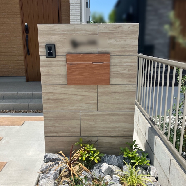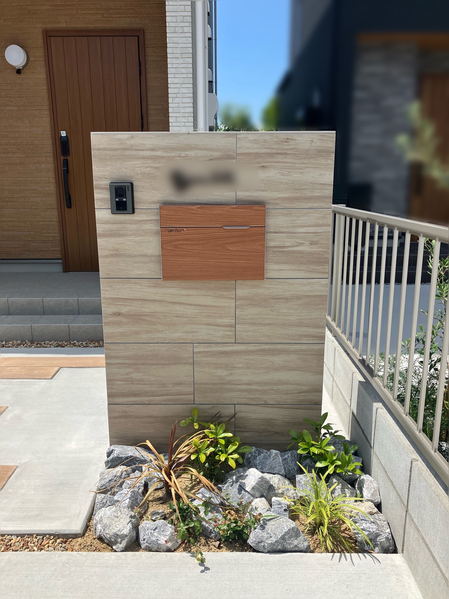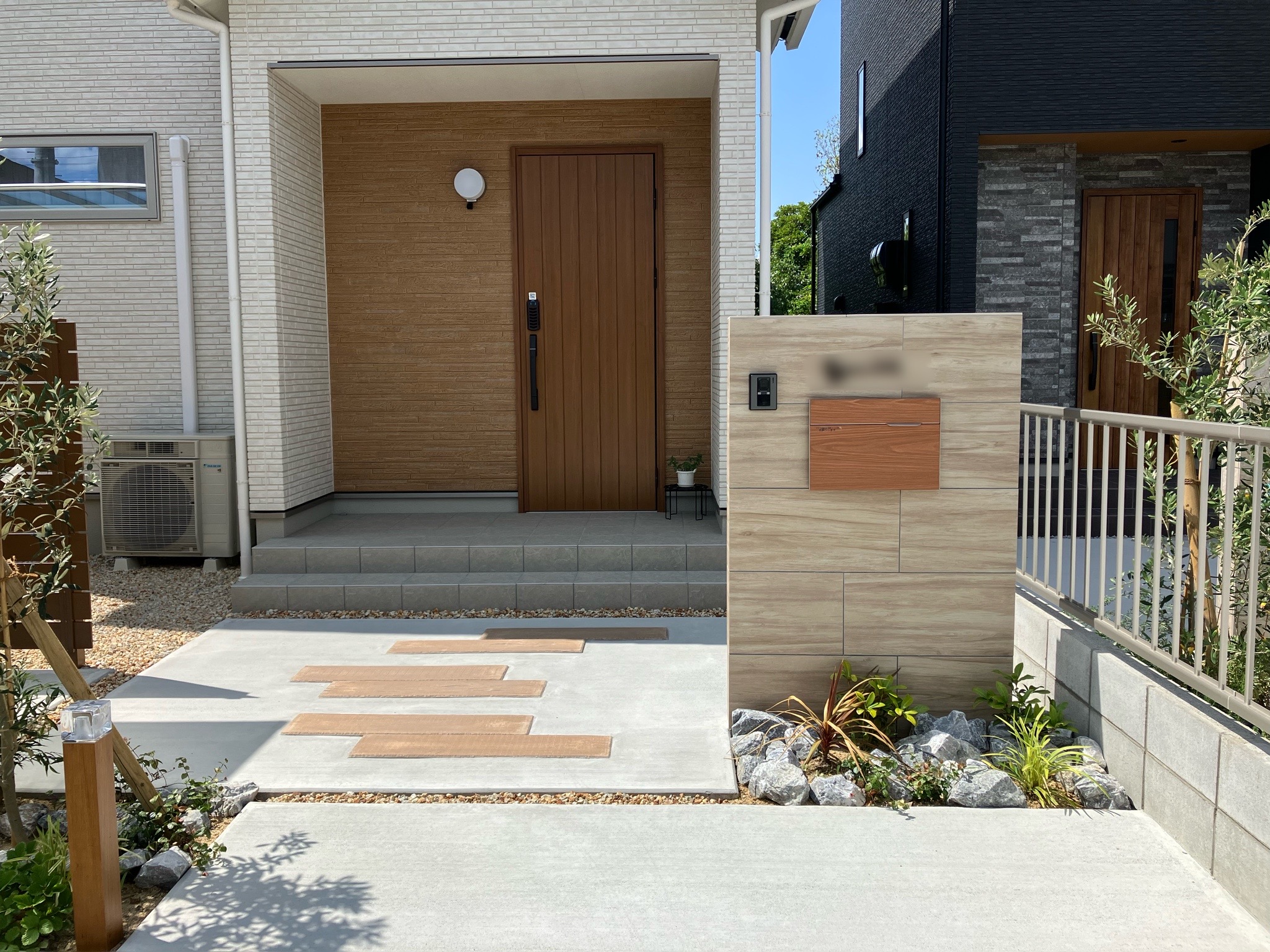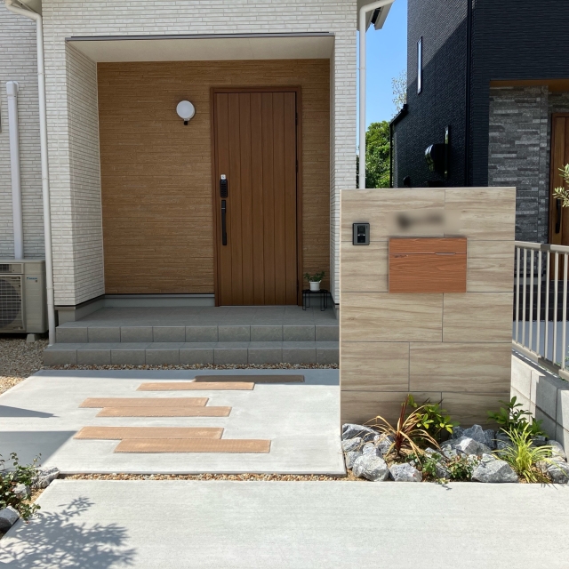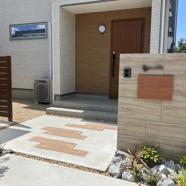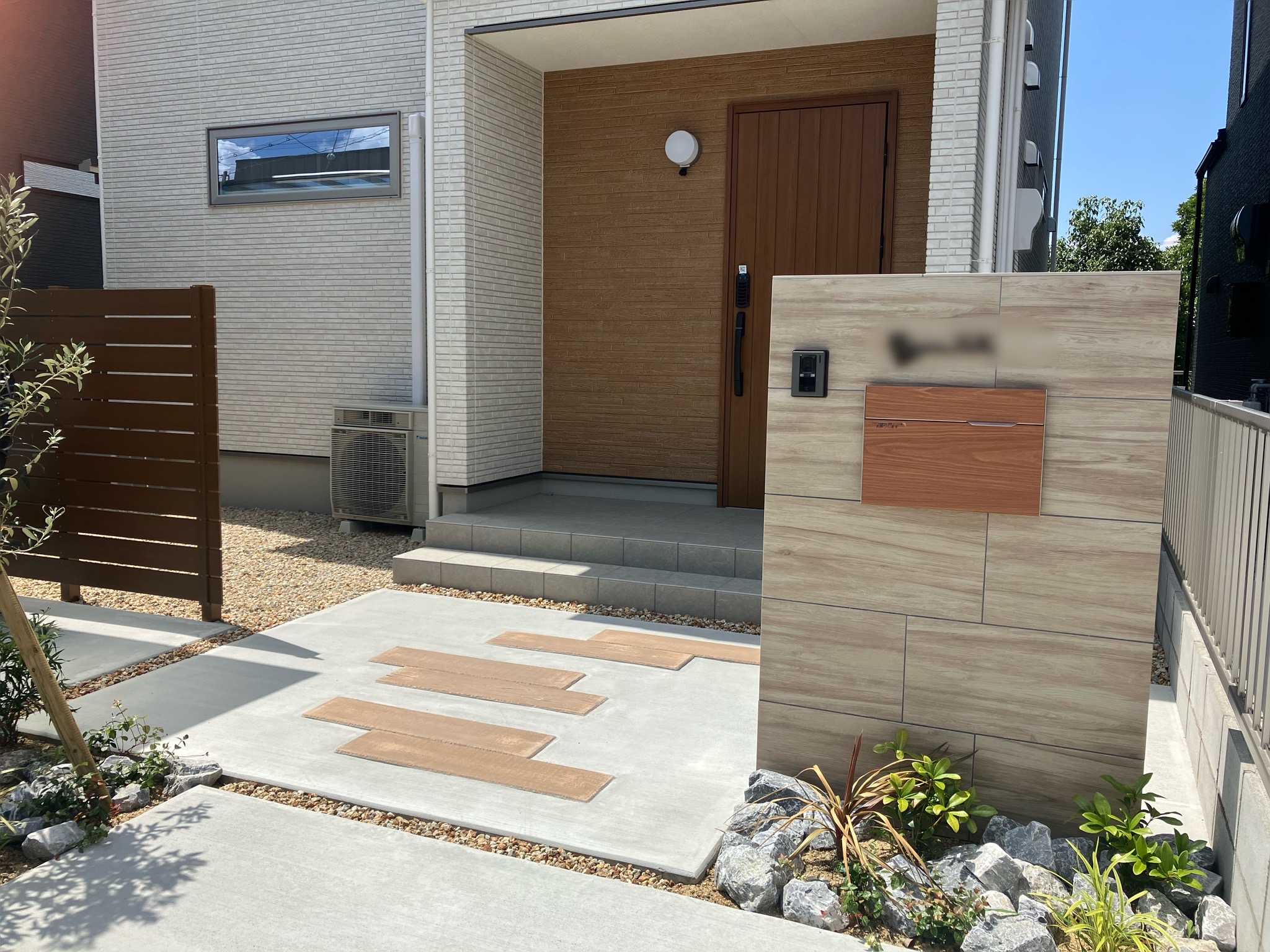 木目調のタイル、舗装材を使用しながらナチュラルで優しい雰囲気の外構です!