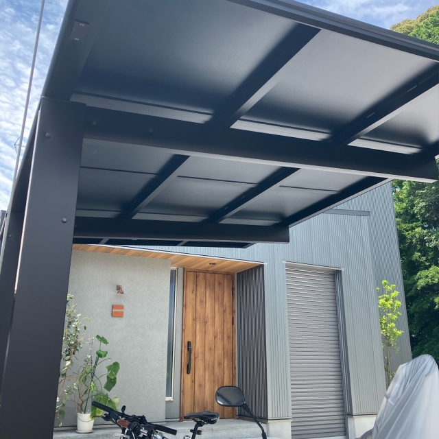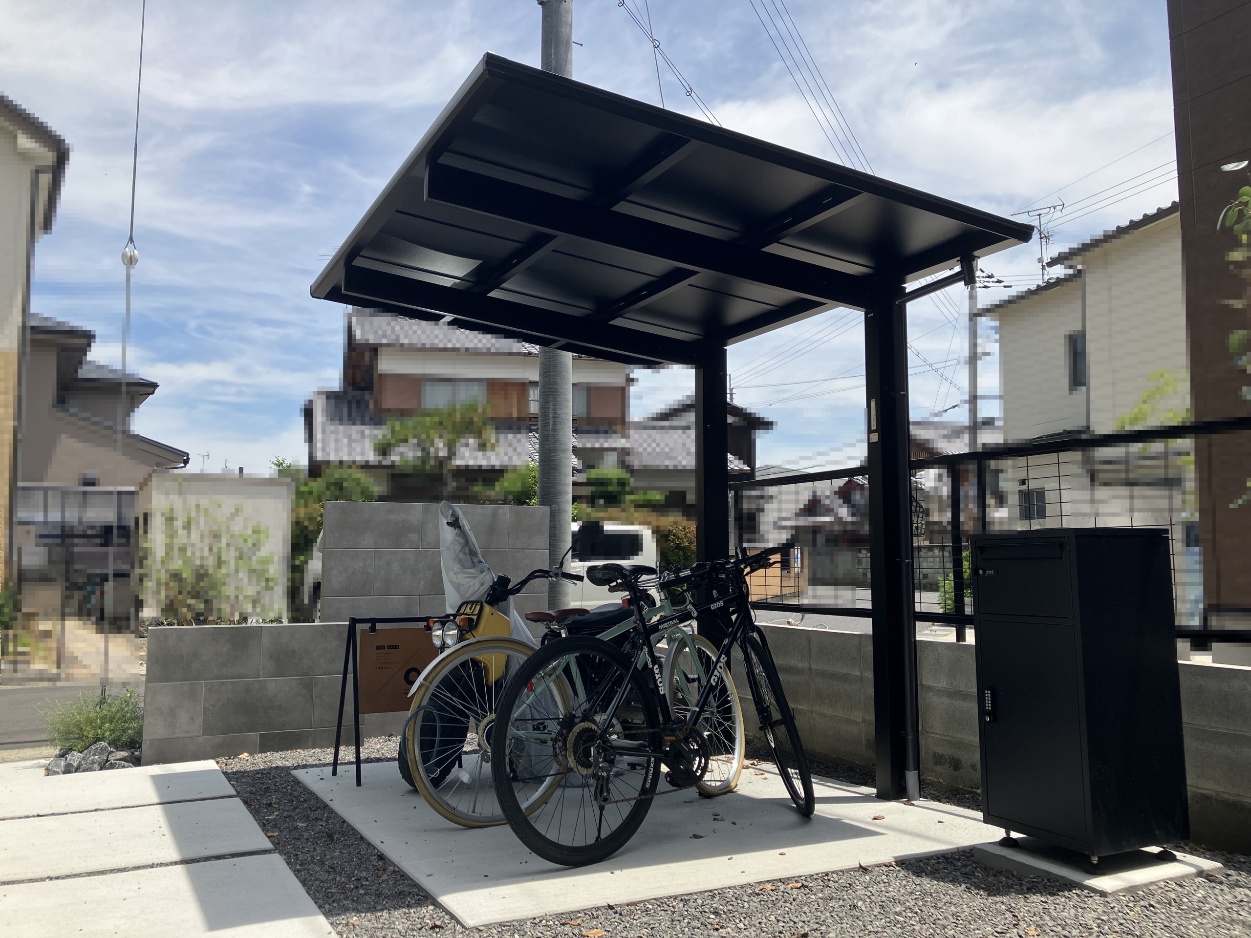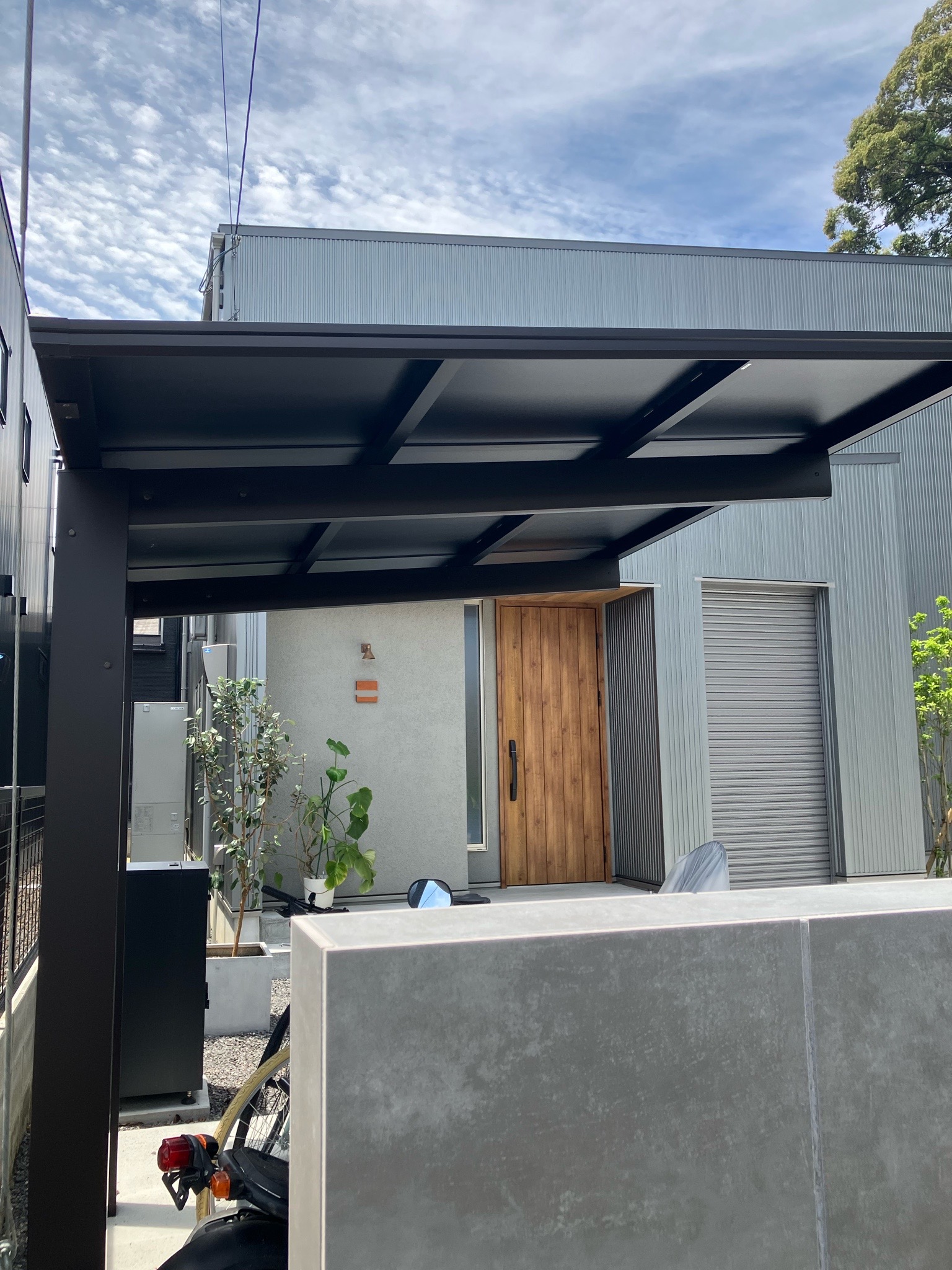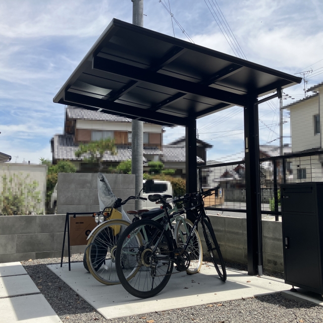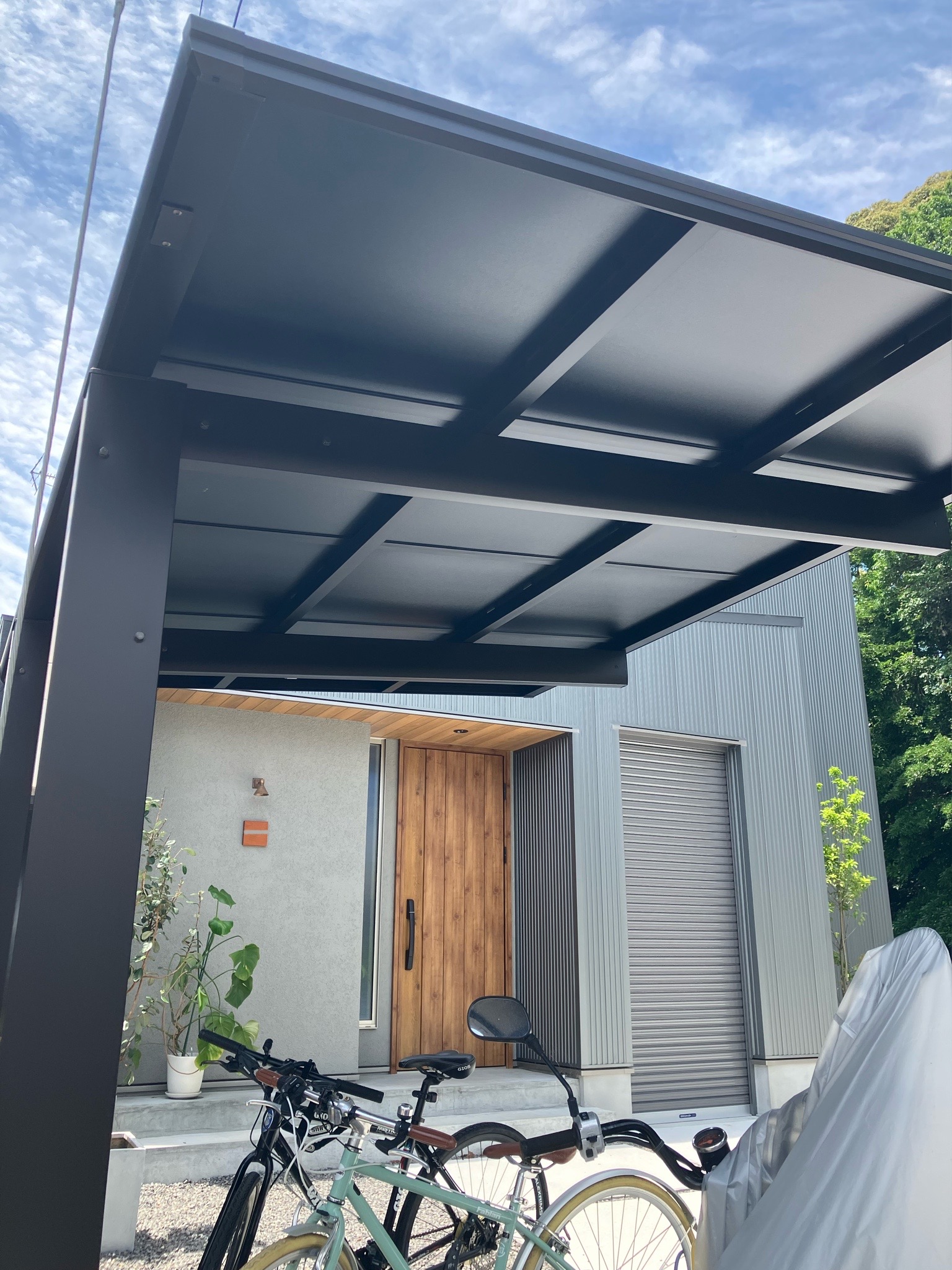 玄関横の表札・照明と被らないように設置位置には一番こだわっています!サイクルポートのサイズも含めて適切なサイズ感にし、自転車を何台停めるのか、自転車以外に置きたいものはあるのかなど仕様用途に応じて高さ、幅、奥行きを必要最低限でご提案させていただきます!