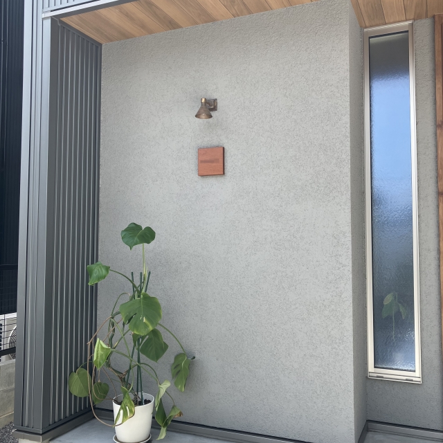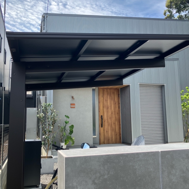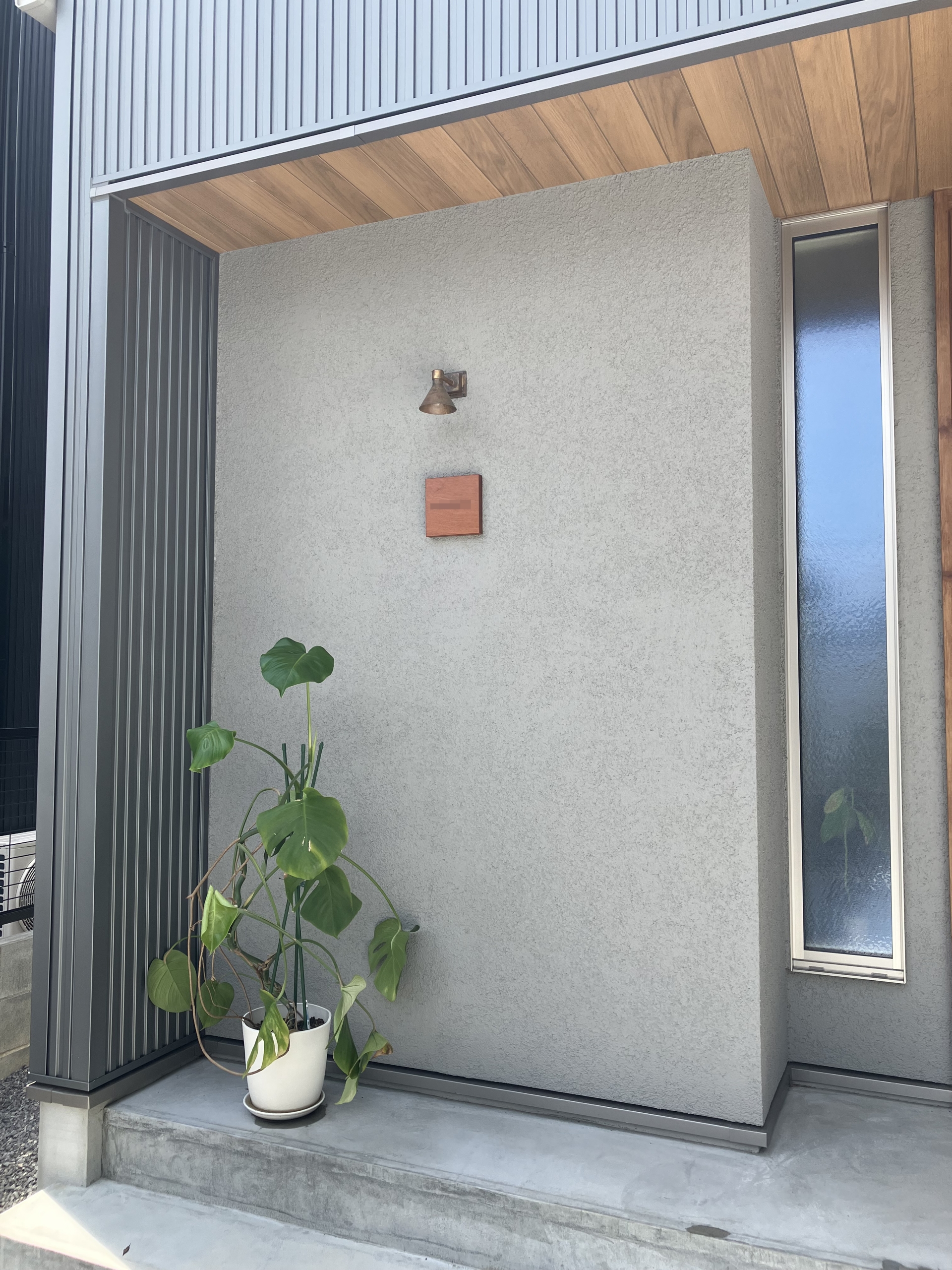玄関横の表札・照明が道路からでも見えるような位置と高さになっていることで、来客があった際でもわかりやすくなっています。サイクルポートの高さは自由が利く場合が多い為自分好みの高さにすることができます!用途や見せたい場所が明確になっている場合だと高さにこだわりがもてるのでより愛着が湧きますね🎶