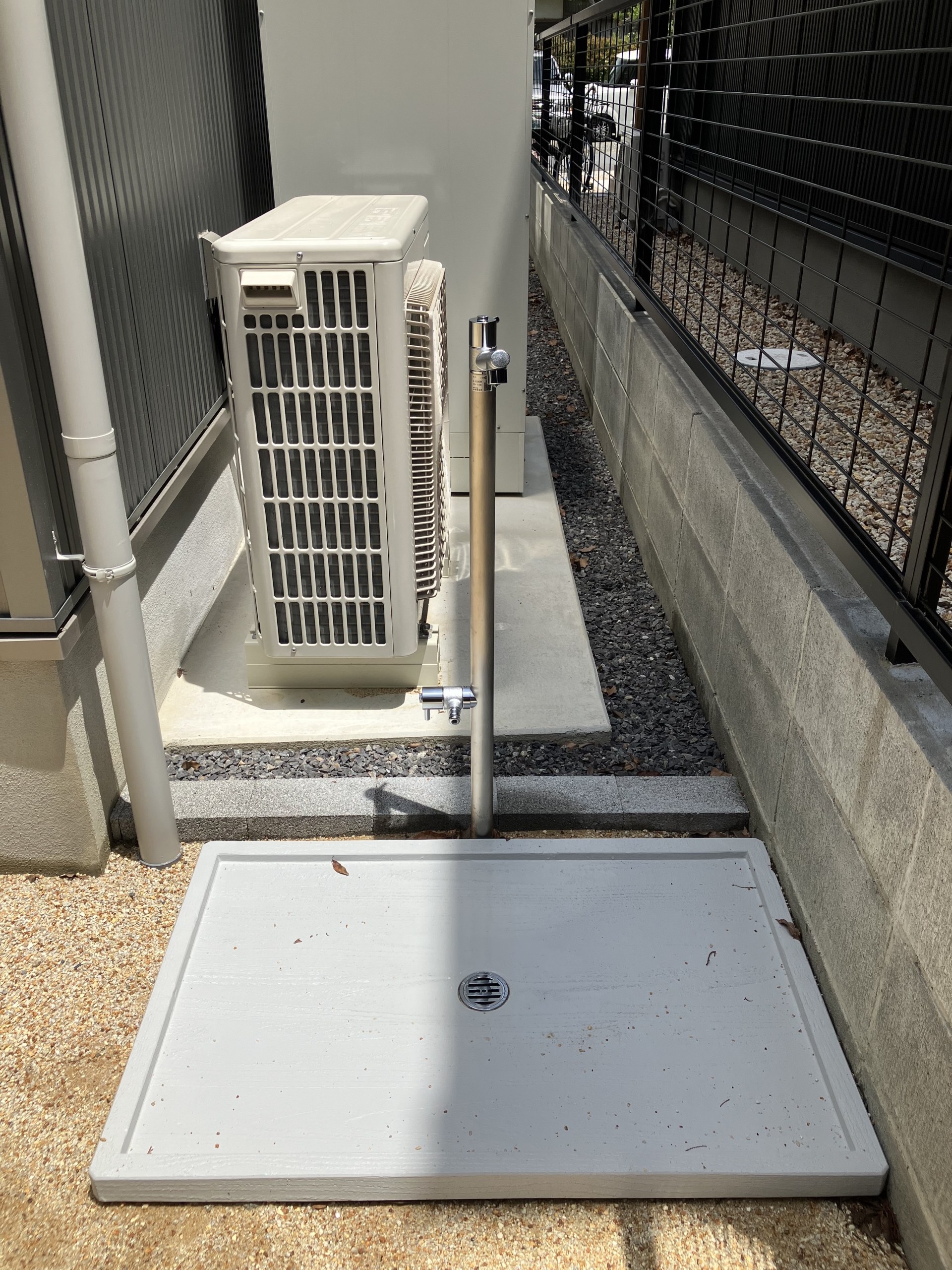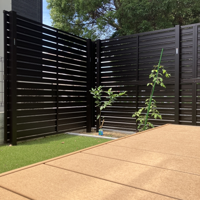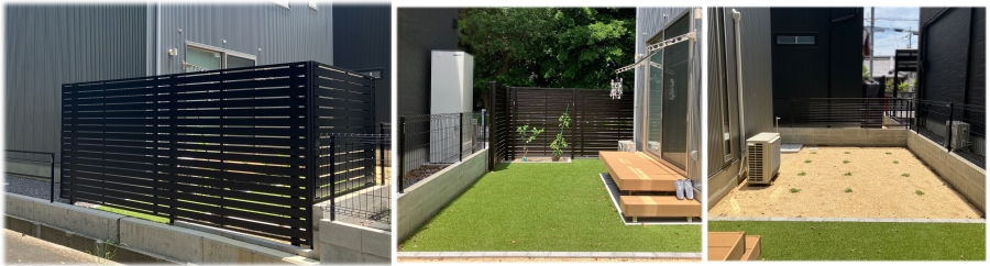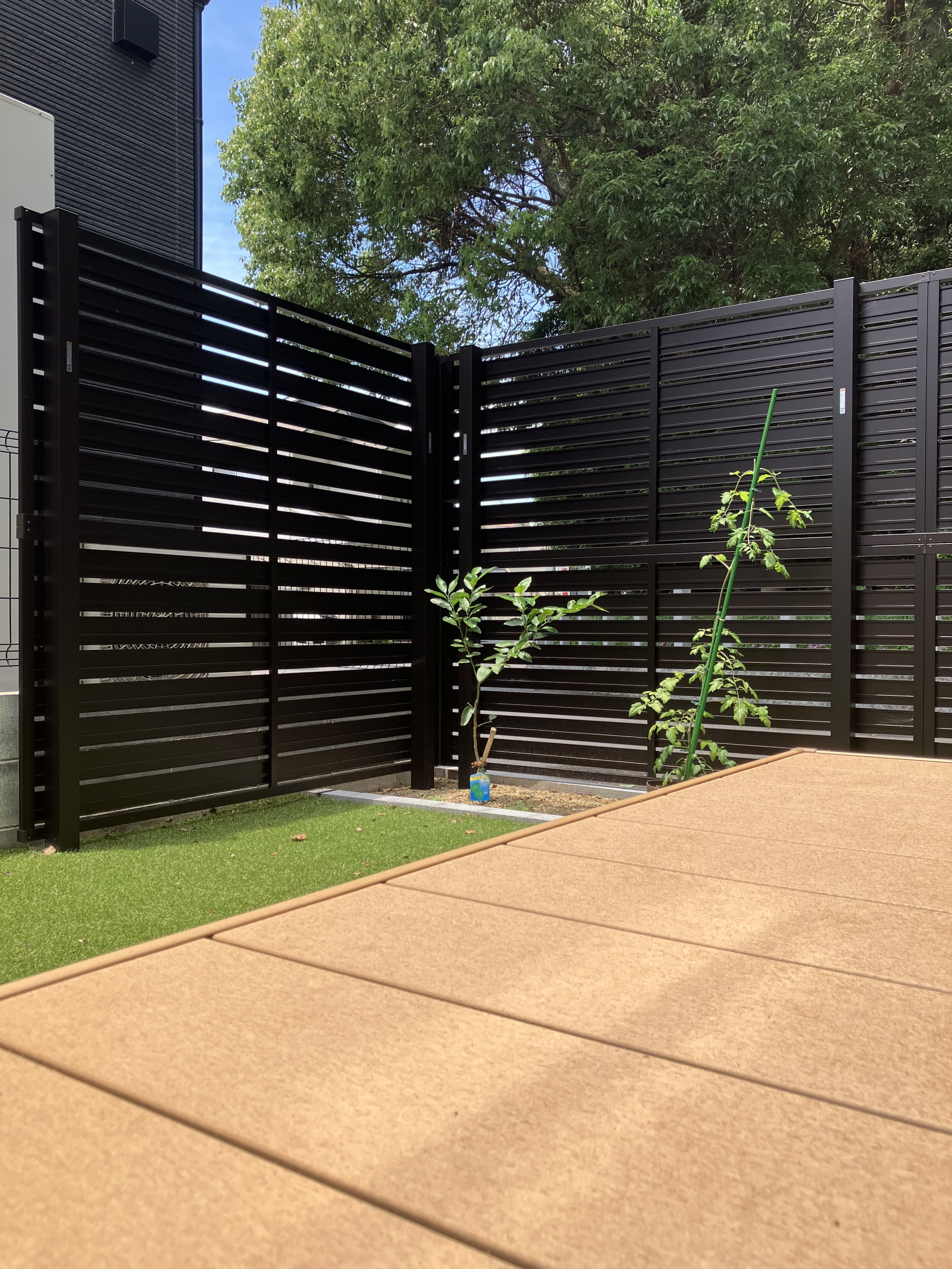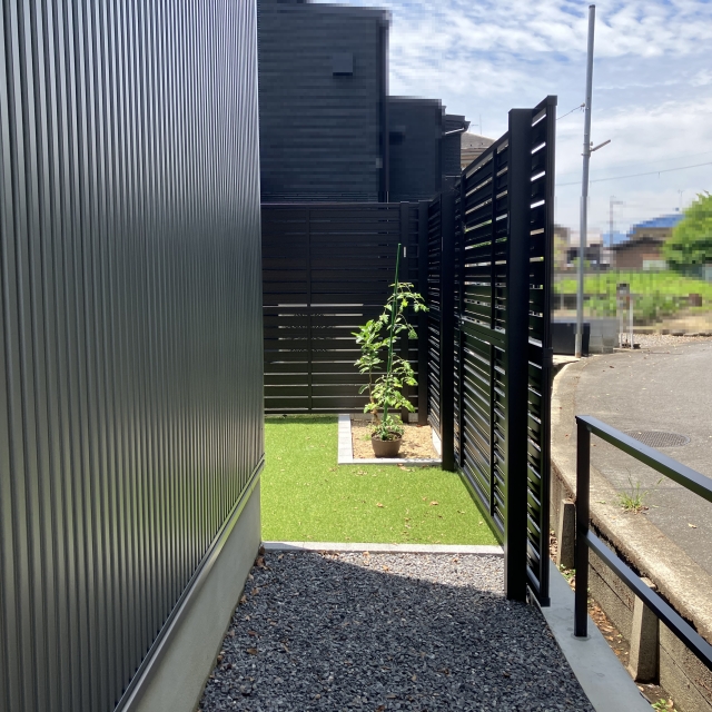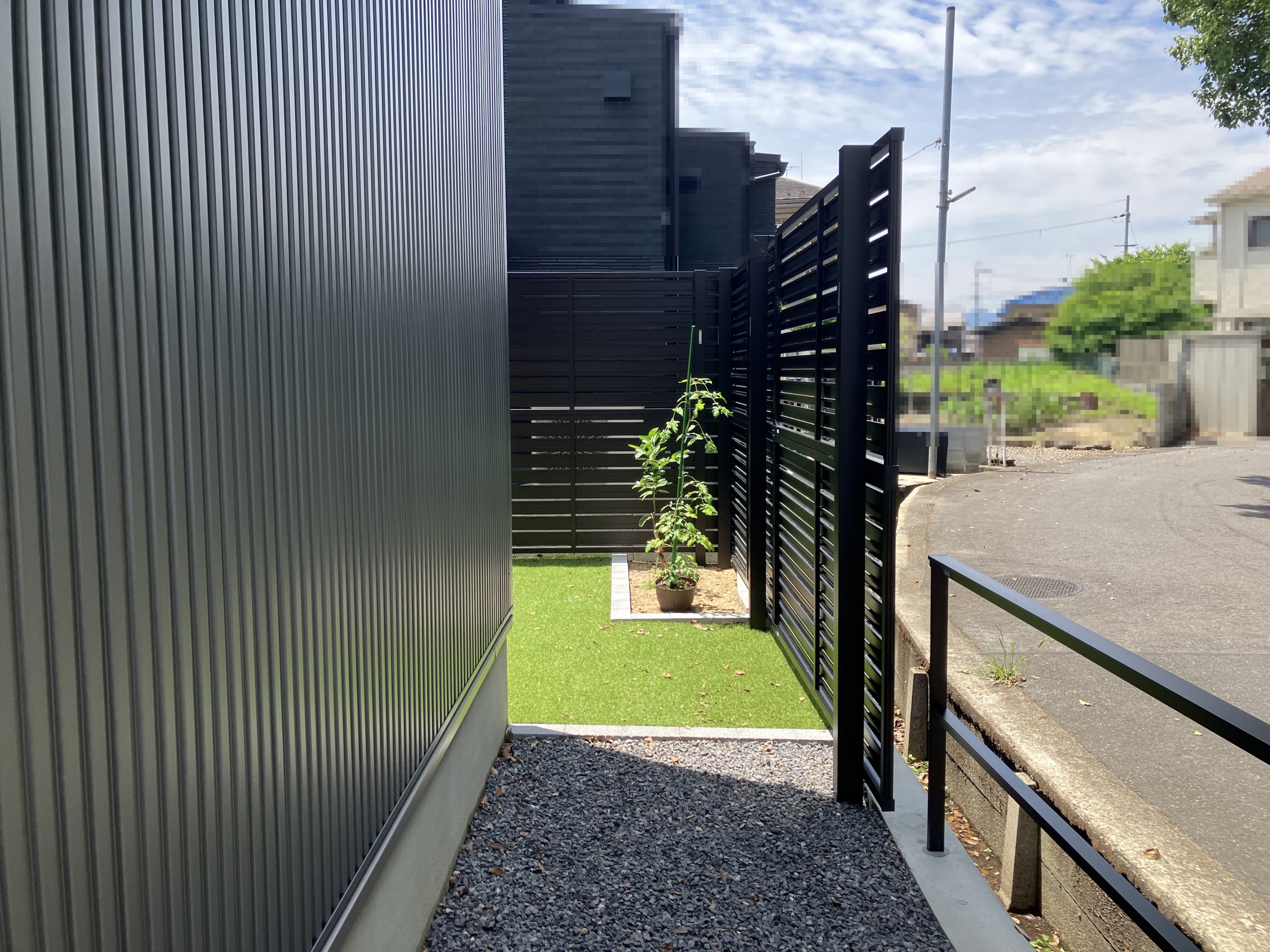 芝スペースと土のスペースの2つを採用していることで、芝スペースではお子様やペットが遊び回れるスペースとなり土のスペースでは芝ではできないBBQができたりテントをたてることができたりします!お家の敷地内でありながら、キャンプの雰囲気を味うことができ、2つのスペースがあることでできることが倍になりますね!道路側には2mの高さの目隠しフェンスを設置することで人目を気にせずにご家族の時間を堪能することができます!