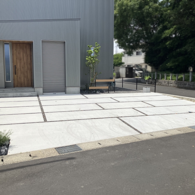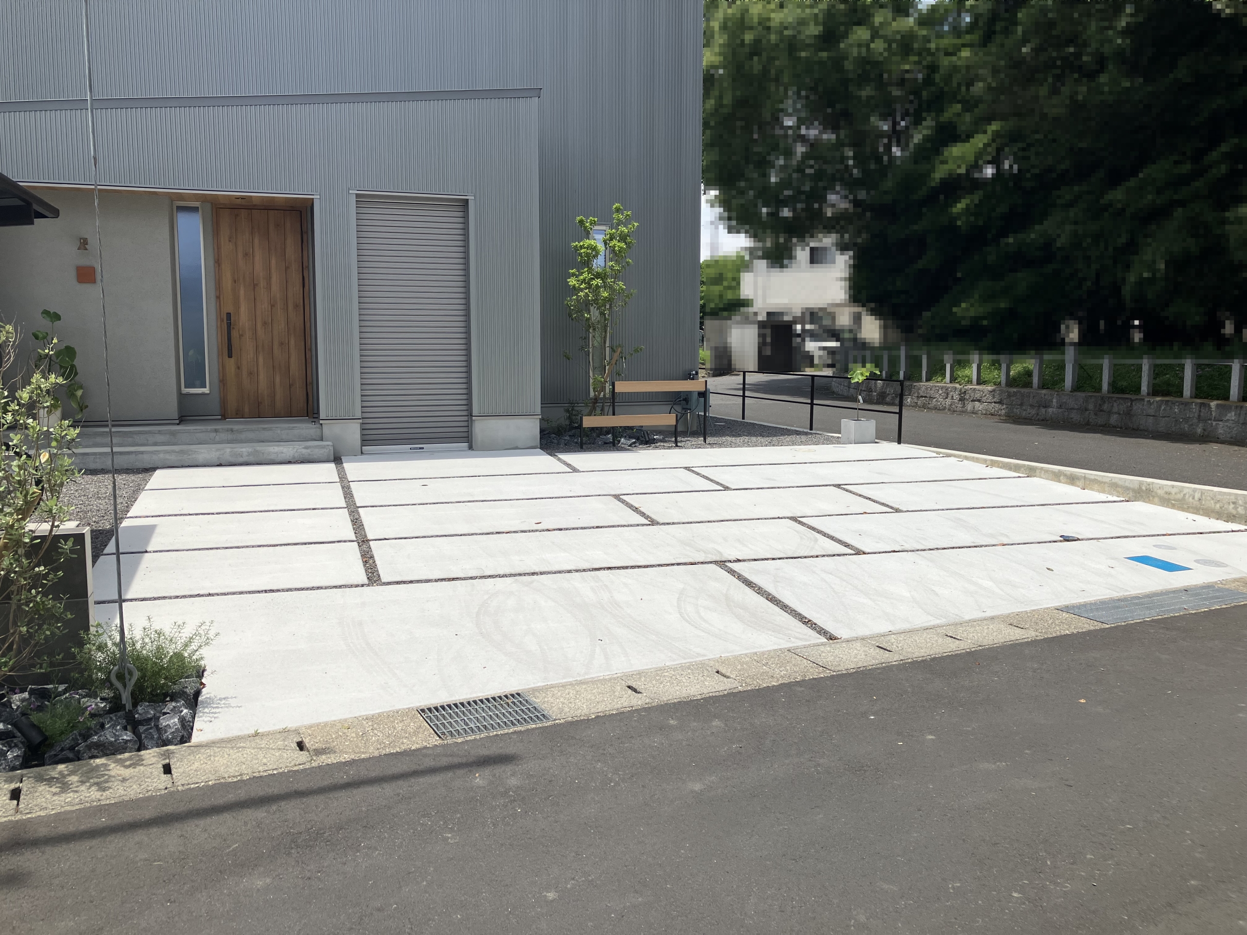 駐車スペースを全て土間にしていることで、アプローチが表現しにくいですが今回は車の駐車スペースとアプローチのスリットの入れ方を変えているので、やんわりとですがアプローチを表現しています!スリットは駐車のための目印にもなりますが、アプローチとの区別化や印象をガラッと変えることのできるので、外構をする際にポイントとなる1つです!